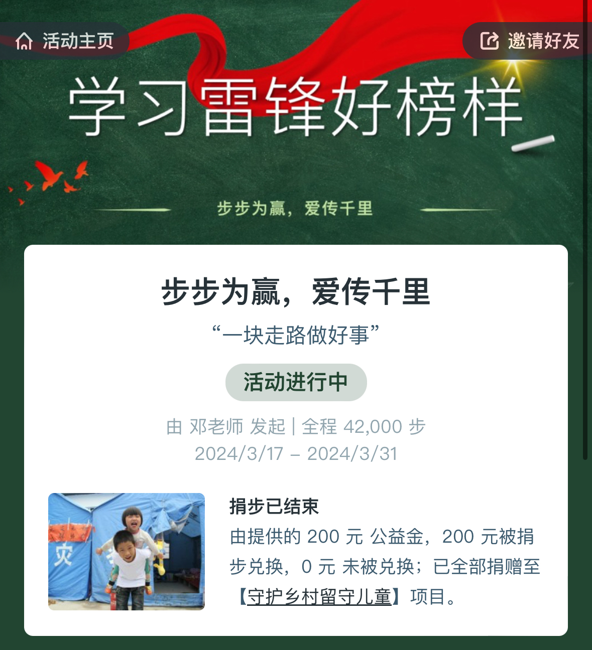 活动采取线上的方式,参与者通过微信小程序一块走”加入队伍每日行走达到规定步数,即可获得公益金。经过数日行走,学子们共走了20576264步,为乡村留守儿童捐200这个数字不仅代表着他们的辛勤付出,更代表着他们对雷锋精神的传承和发扬。其中,23级智能制造2班许家鑫、23级智能制造2班梁正璞、22级机械设计制造及其自动化 1班孙明宇表现优异,获评“优秀志愿者”称号。