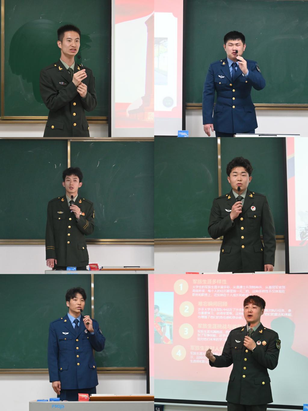 宣讲会上,来自校退役士兵宣讲团6名同学以“淬火成钢 铸就无悔青春”为主题展开分享。通过结合亲身经历,展示军营生活纪实照片和视频短片,讲述在部队中锤炼意志、淬炼品格的成长故事,生动再现了队列训练、战术演练等真实场景,展现出新时代青年军人“听党指挥、能打胜仗、作风优良”的精神风貌。“两年的军旅生活教会我什么是责任与担当,部队带给我的不仅是技能,更是受益终身的纪律意识和家国情怀”。宣讲团同学们饱含深情的讲述赢得了现场阵阵掌声。