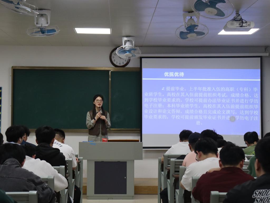 随后,学生处邵琦皎老师围绕学费补偿代偿、考研专项计划、公务员定向招录等相关政策进行深入解读,强调携笔从戎是新时代青年实现人生价值的重要路径。